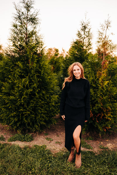 This longline skirt crafted from a ribbed knit blend exudes simplicity and versatility. The fitted silhouette with a distinctive slit adds a touch of allure, making it perfect for pairing with a turtleneck and ankle boots for a chic seasonal ensemble. Pair with the Comfy Cozy Turtleneck Sweater (pictured)!