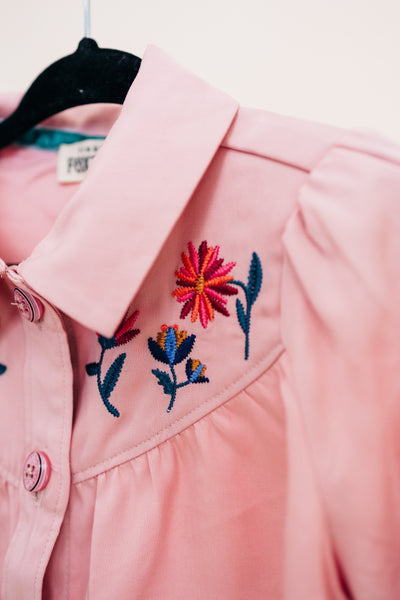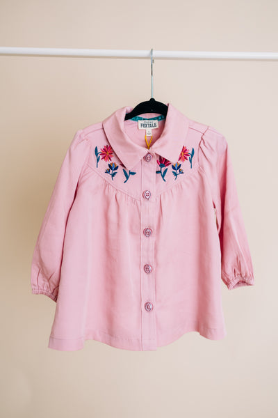 The smooth Tencel fabric is grounded in a soft pink shade, topped with twinkling buttons, and finished with a brilliantly bold embroidered bouquet on the bodice. This thoughtful style has a lined yoke, so you get all the darling details without discomfort. Pair this blooming beauty with everyday leggings during the colder months, or size up and wear as a dress when spring comes!